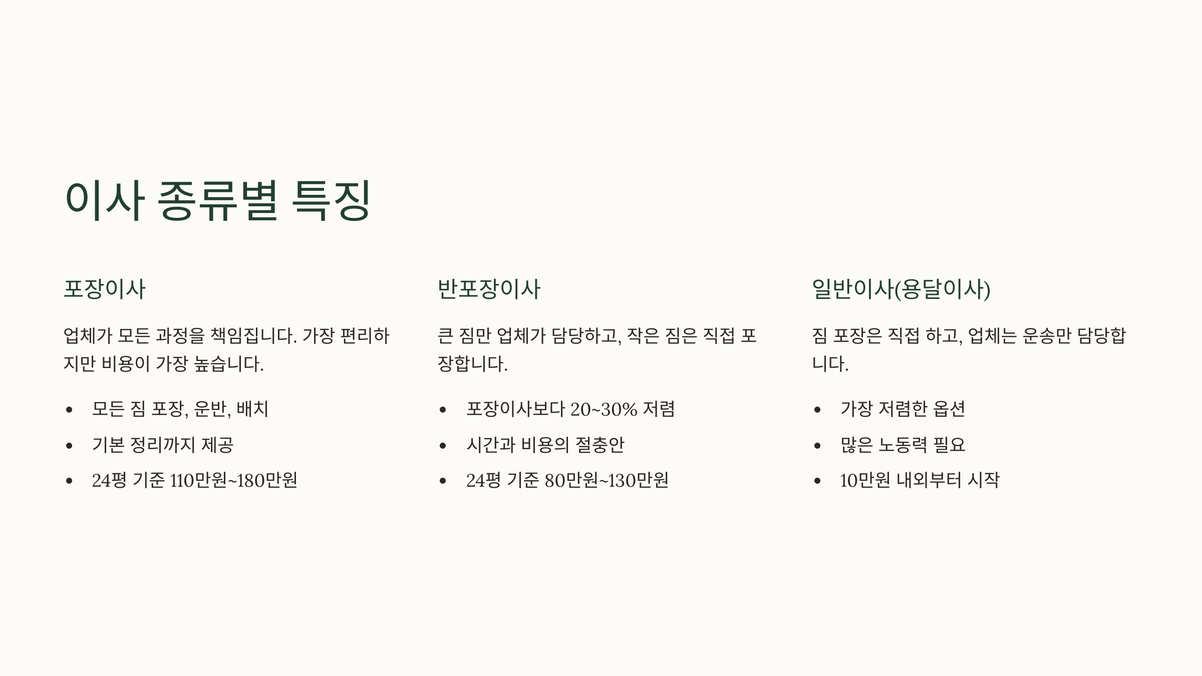 이사는 크게 포장이사, 반포장이사, 일반이사(용달이사)로 나눌 수 있습니다. 서비스 범위와 비용이 다르니, 상황과 예산에 맞게 선택하는 것이 중요합니다.
