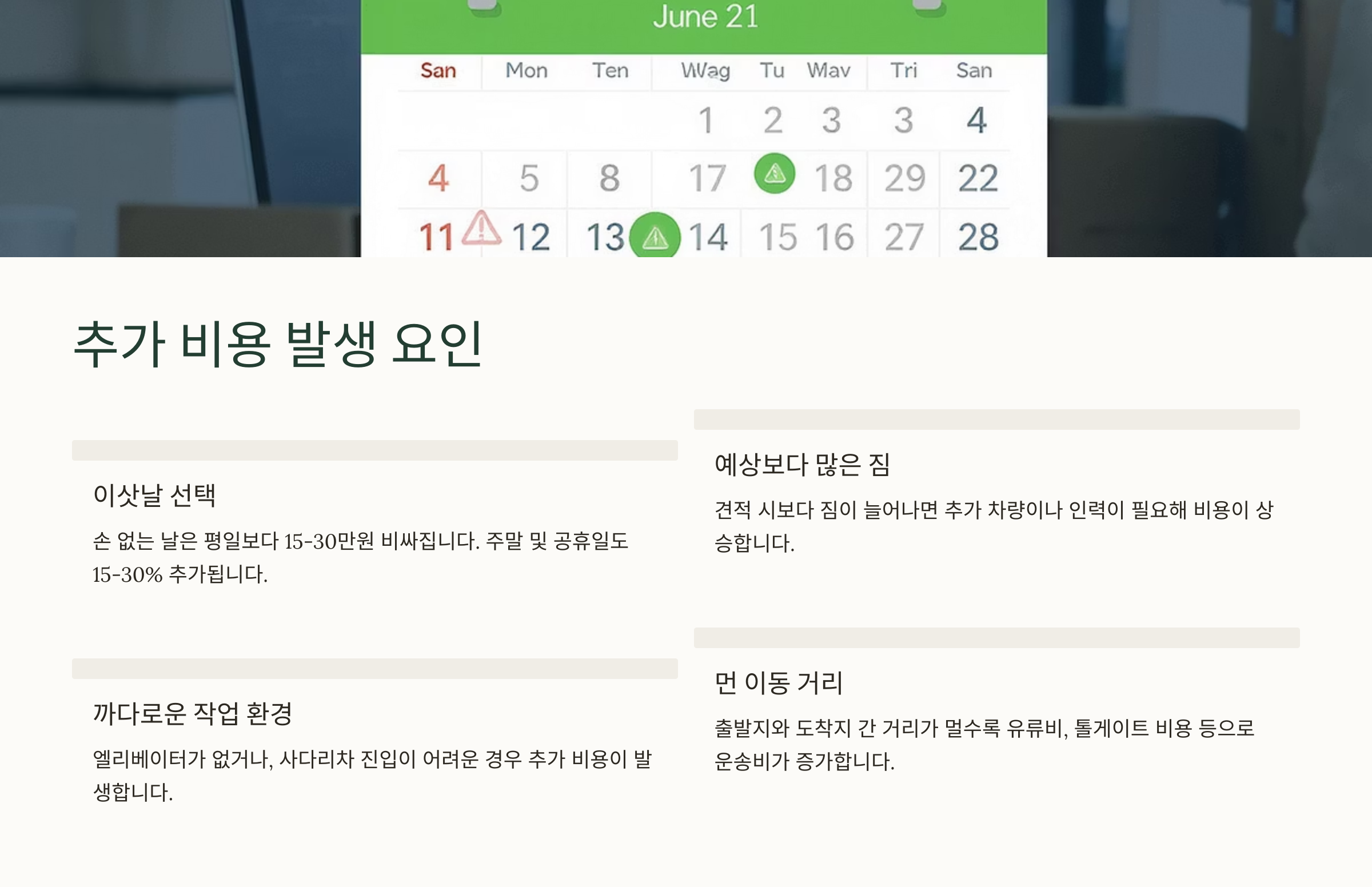 - 예상보다 많은 짐의 양: 견적 시보다 짐이 늘어나면 추가 차량이나 인력이 필요해 비용이 상승합니다.