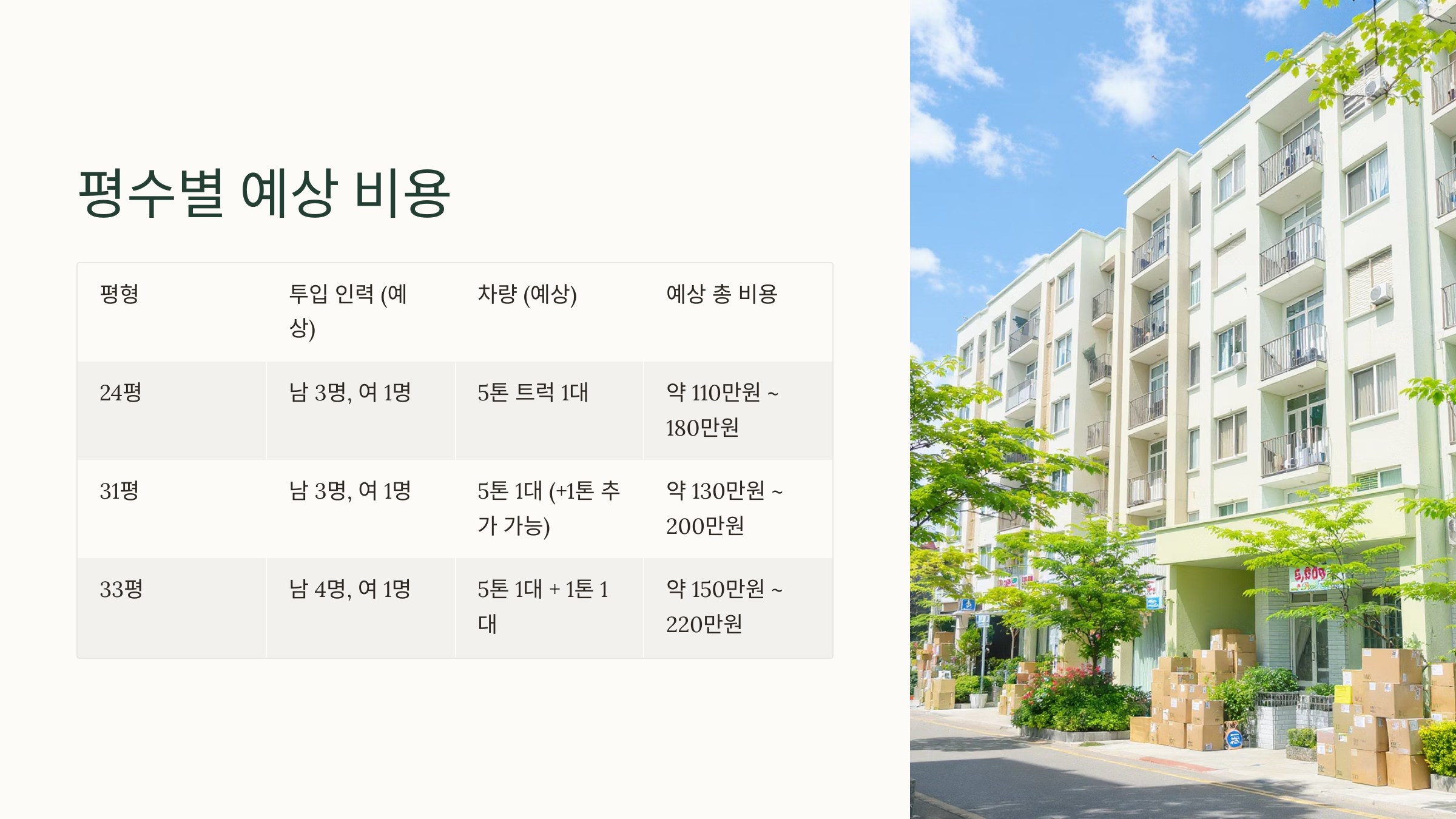 24평 | 남 3명, 여 1명 | 5톤 트럭 1대 | 약 110만 원 ~ 180만 원 |