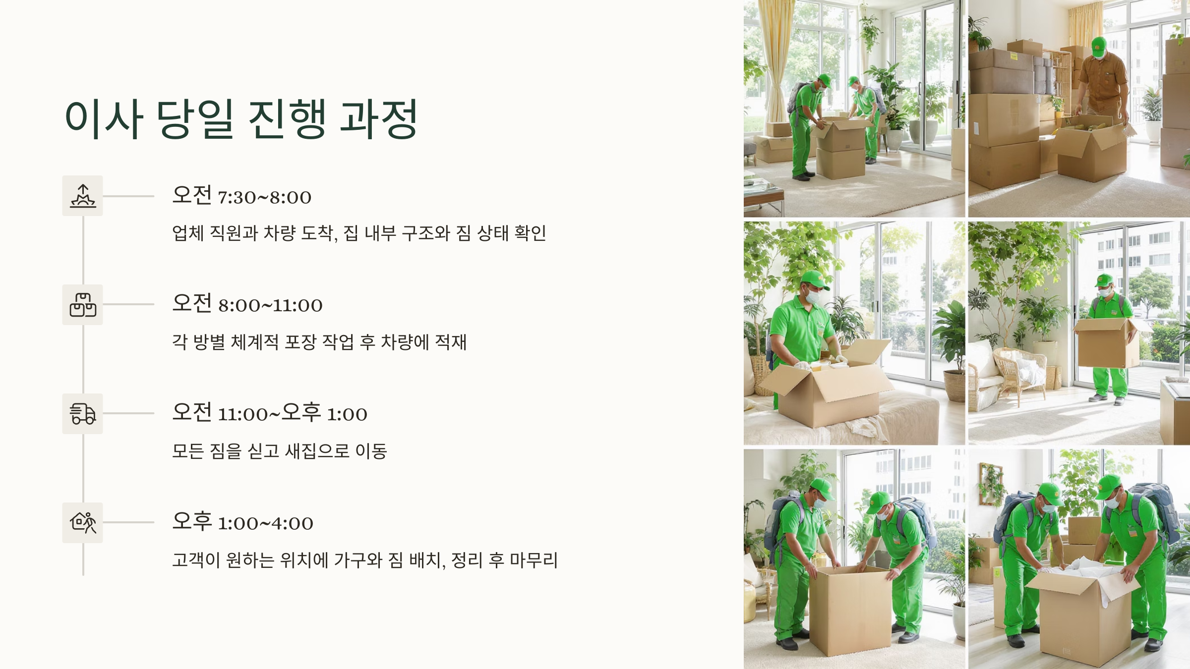 - 포장 및 반출 (오전 8시 ~ 11시): 각 방별로 체계적인 포장 작업 후 차량에 적재합니다.
