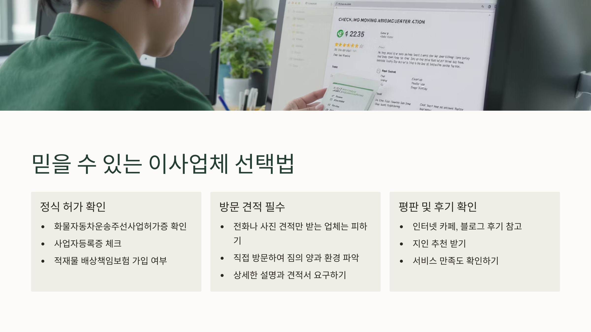 - ✅ 관허업체 여부 확인: 정식 허가받은 업체인지 확인하세요. (화물자동차운송주선사업허가증 등)