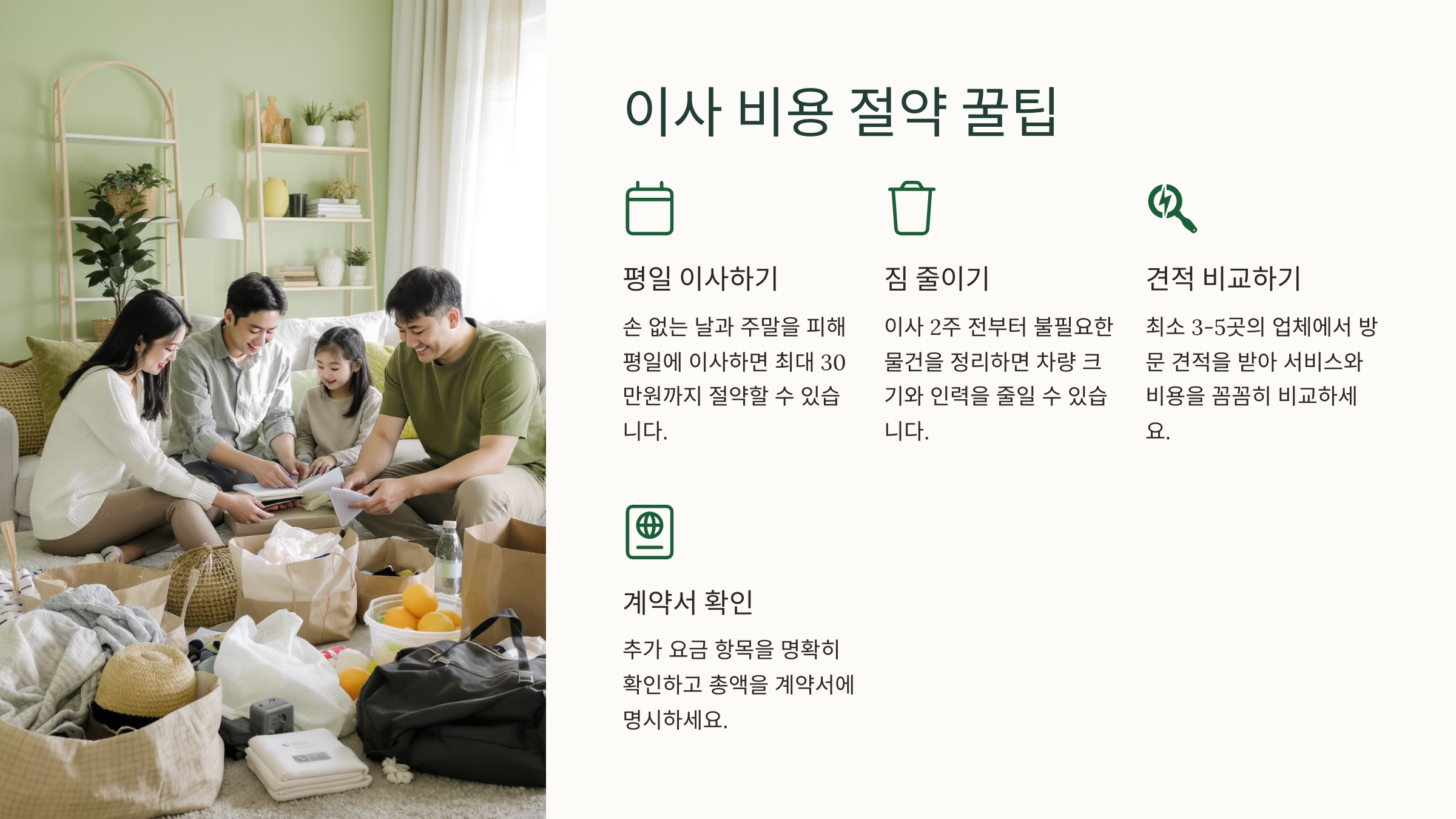 - 이사 날짜는 평일로: 손 없는 날과 주말, 공휴일을 피해 평일에 이사하면 가장 확실한 비용 절약.